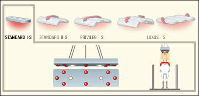 Standard II-S Durch zwei leistungsstarke Elemente wird mit dem Pferde-Solarium STANDARD II-S ein gleichmäßiges und intensives Besonnen erreicht. Lieferumfang: 2 Polyestergehäuse, Kopplungsträger, 1 Steuergerät mit Zeituhr und Wahlschaltern für alle Erweiterungsmöglichkeiten, Kettenaufhängung, Steuerleitung, 16 IR-Strahler à 250 Watt, 4 UV-Strahler à 300 Watt